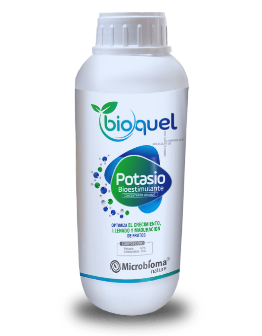 BIOQUEL POTASIO, es un bioestimulante de elevada concentración de potasio complejado con carboxilatos. Esta molécula se transporta rápidamente en la planta asegurando una mayor asimilación. El potasio es indispensable en los procesos de crecimiento y maduración de frutos, lo cual va a mejorar el rendimiento y calidad de las cosechas.