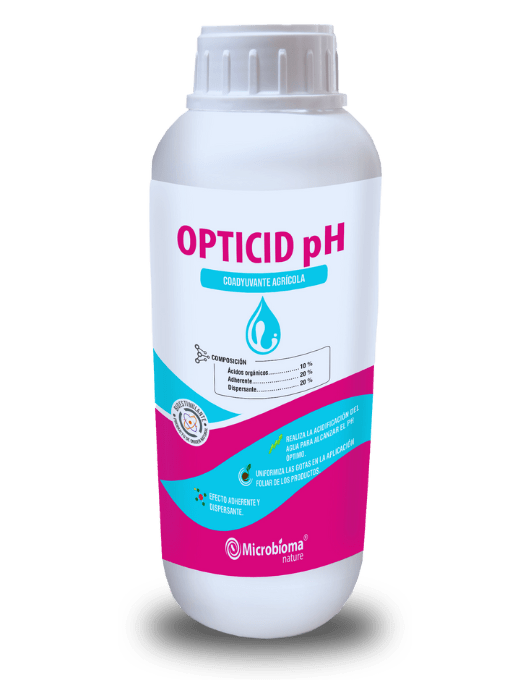 OPTICID pH, realiza la acidificación del agua para alcanzar el pH óptimo, donde los plaguicidas alcanzan el 100% de eficacia. También reduce la tension superficial del agua lo que permite que la solución asperjada cubra de manera uniforme el área foliar de los cultivos. Es ideal para su uso con agroquimicos, fertilizantes foliares y bioestimulantes hacienda más rápida la absorción foliar.