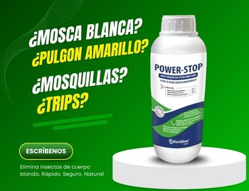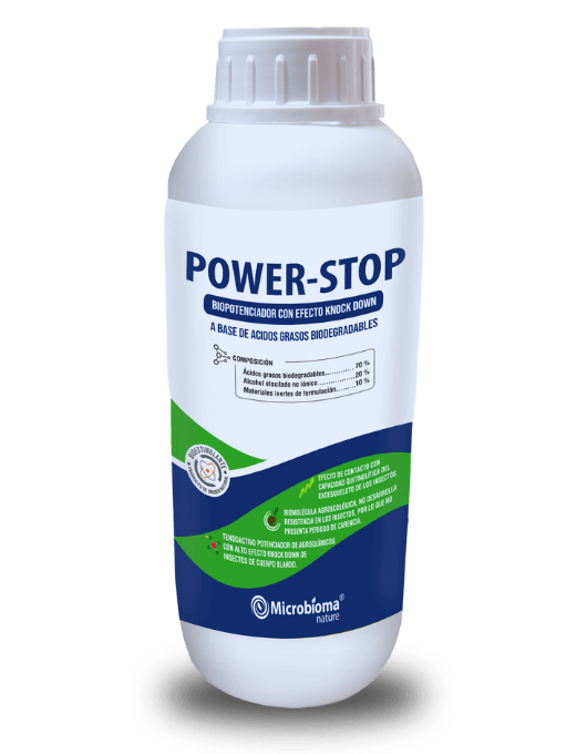 POWER - STOP los ácidos grasos biodegradables agroecológicos actúan de contacto rompiendo la matriz de lipoproteínas de la cutícula y membrana celulares (capacidad quitinolitica) y otras sustancias no polares, componentes fundamentales del exoesqueleto de los insectos de cuerpo blando en todas sus fases: larva, ninfa y adulto. Distorsiona su permeabilidad y fisiología celular causando el derrame de los líquidos corporales del insecto. Así mismo ayuda a minimizar las mielecillas excretadas por los insectos al alimentarse.