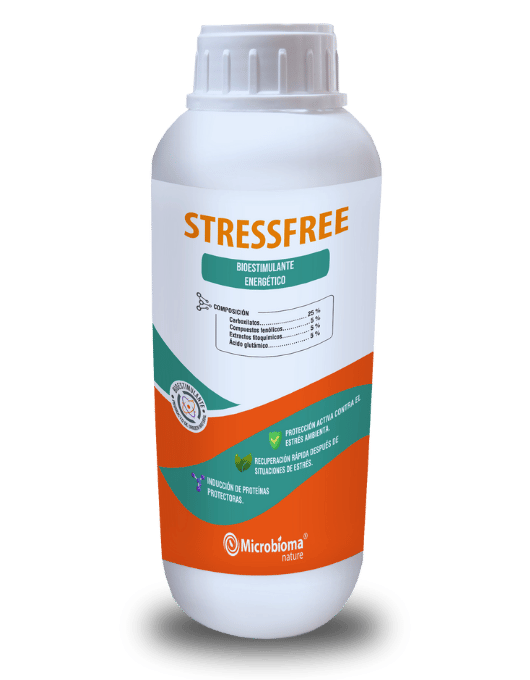 Stressfree, es una bioestimulante energético con alta capacidad antioxidante, formulado con carboxilatos de bajo peso molecular, compuestos fenólicos y ácido glutámico obtenidos por hidrólisis enzimática.